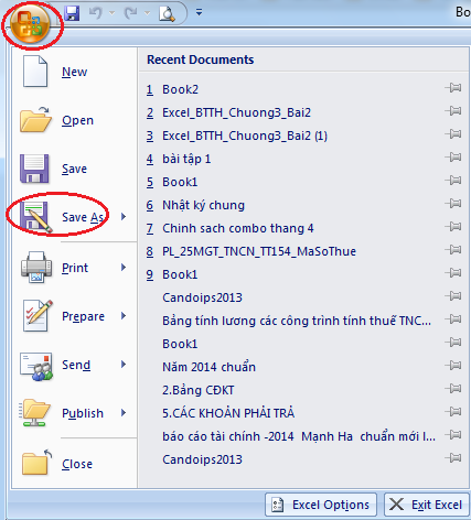 - Bấm menu Office Button (File) ,chọn Save As