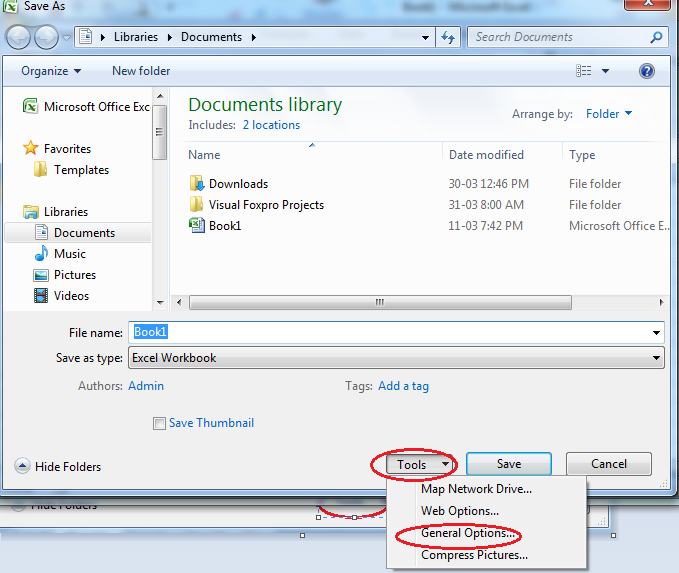 -Bấm menu Tools trong mục Save As , chọn General Options
